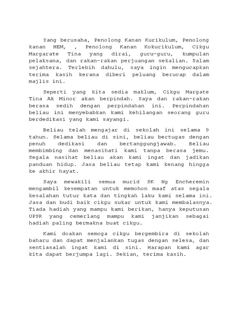Pidato perpisahan dari siswa yang lulus biasanya berisikan ucapan terima kasih kepada para guru dan ditutup dengan salam perpisahan. Teks sambutan ketua panitia pada acara perpisahan sekolah yang singkat dan mudah … Terdapat contoh sambutan perpisahan sekolah dari perwakilan murid, kesan saat bersama di … Pidato perpisahan biasanya disampaikan oleh perwakilan dari angkatan yang lulus. Meski begitu, ucapan terima kasih kepada guru bahasa inggris ini sudah dilengkapi dengan artinya.